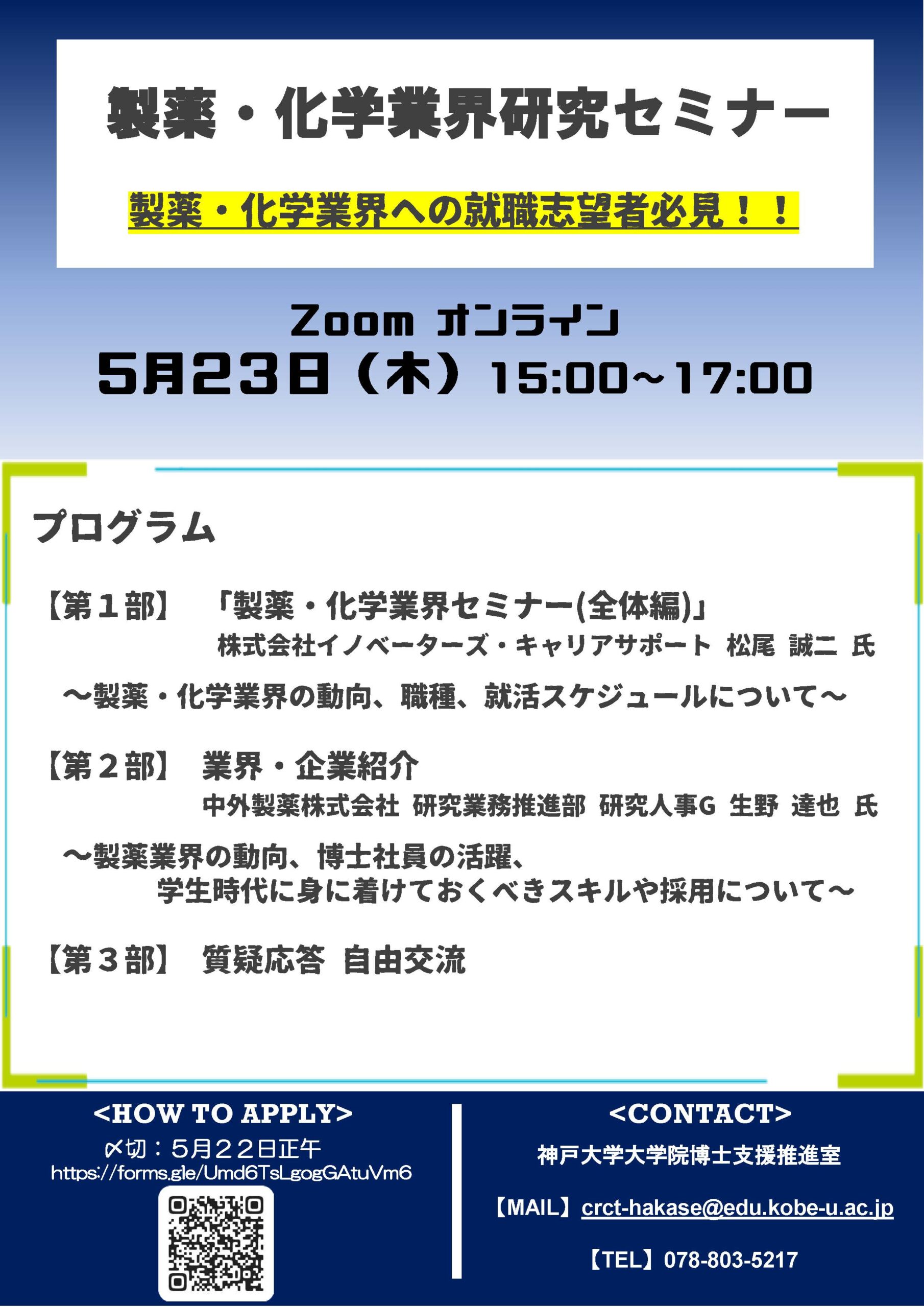 2024.05.23(木) 大学院生 博士向け 留学生向け 【修士・博士】神戸大学主催:製薬・化学業界研究セミナー キャリアデザイン 、キャリア支援 、博士課程 、就職活動 、留学生 博士人材育成コンソーシアムからのお知らせです! 開催日時 製薬・化学業界研究セミナー 形式 2024年5月23日(木)15:00-17:00 言語 Zoomオンライン 対象者 コンソーシアム所属大学の博士課程学生(MC・DC)と博士研究員(PD) 申込方法 締切:5/22(水)正午 フォームよりお申込みください。 申込 PREV 一覧へ戻る NEXT