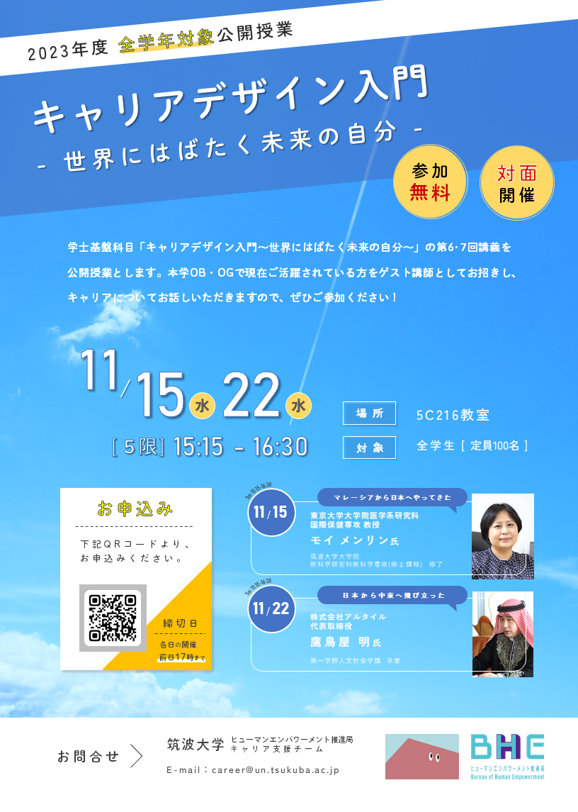 ゲストスピーカーとして筑波大学卒業生が、自分の歩んできた人生を語り、後輩の皆さんに、力強いメッセージを届けてくれます。