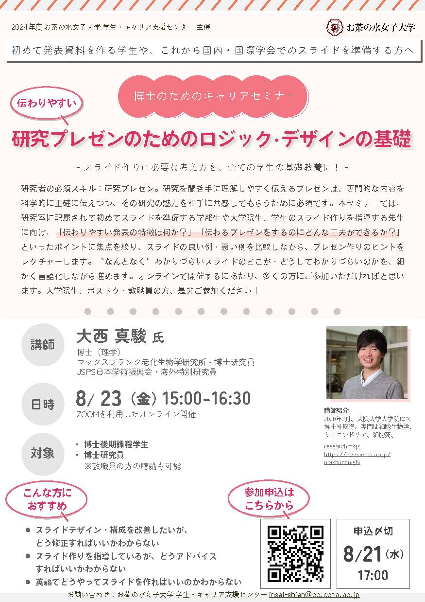 本セミナーでは、主に異分野の人に向けてご自身の研究を伝える機会のある博士後期課程学生を対象に、実際の例を紹介しながら、「伝わりやすい発表の特徴は何か」「理解し、共感してもらえるプレゼンには、どんな工夫が必要か」という点について、研究スライド・ポスター作り、英語を使用する際の作成のコツをお伝えします。