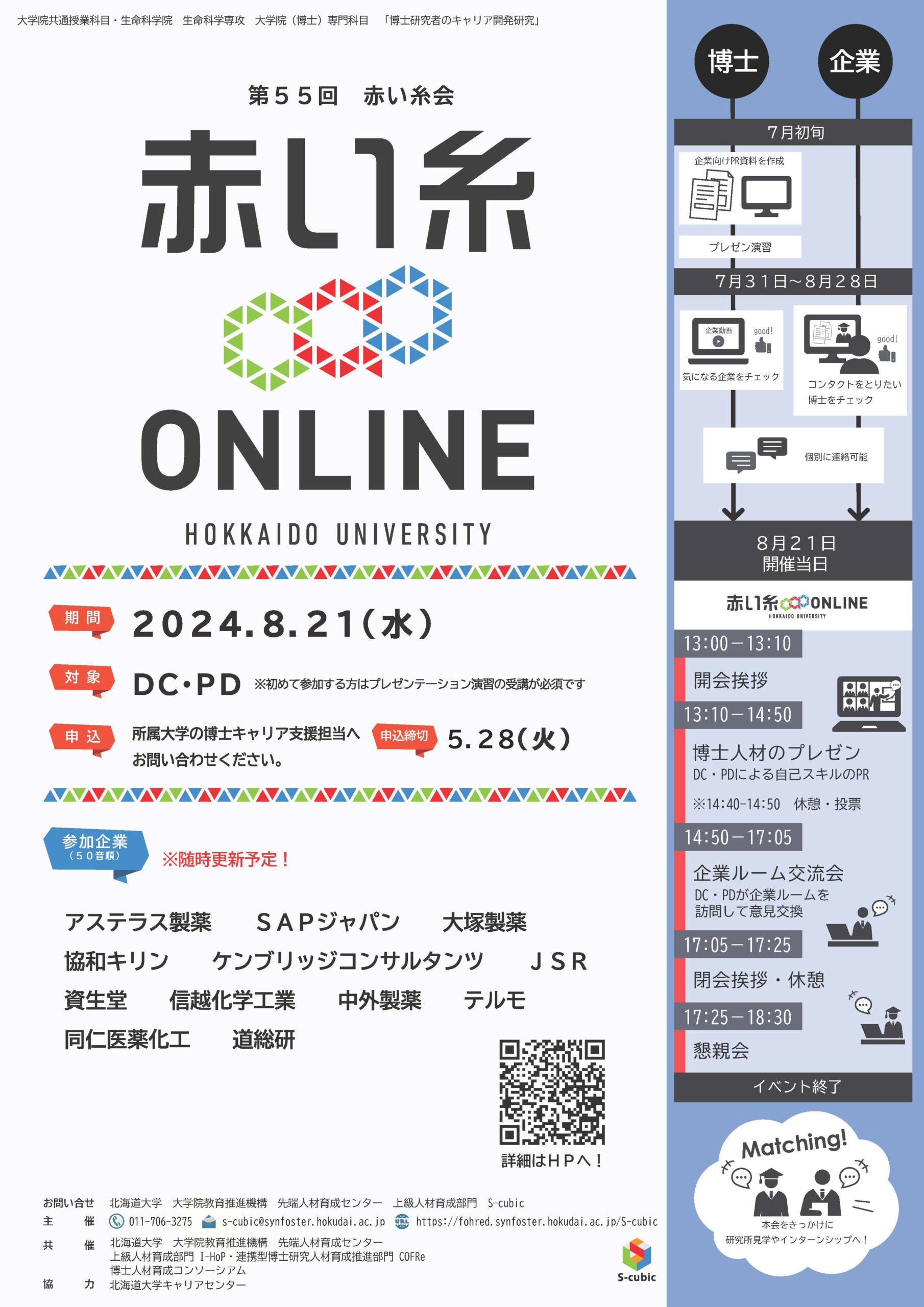 赤い糸会は、大学院博士後期課程学生(DC)および博士研究員(PD)等の若手研究者と企業の方々との直接交流の場です。