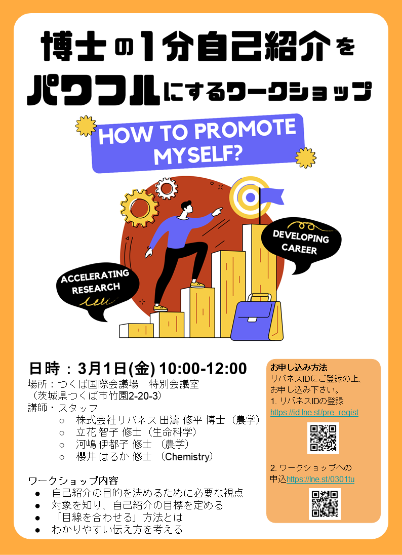 申込方法:リバネスIDにご登録の上、「博士の1分自己紹介をパワフルにする〜QPMIワークショップ〜」にお申し込み下さい