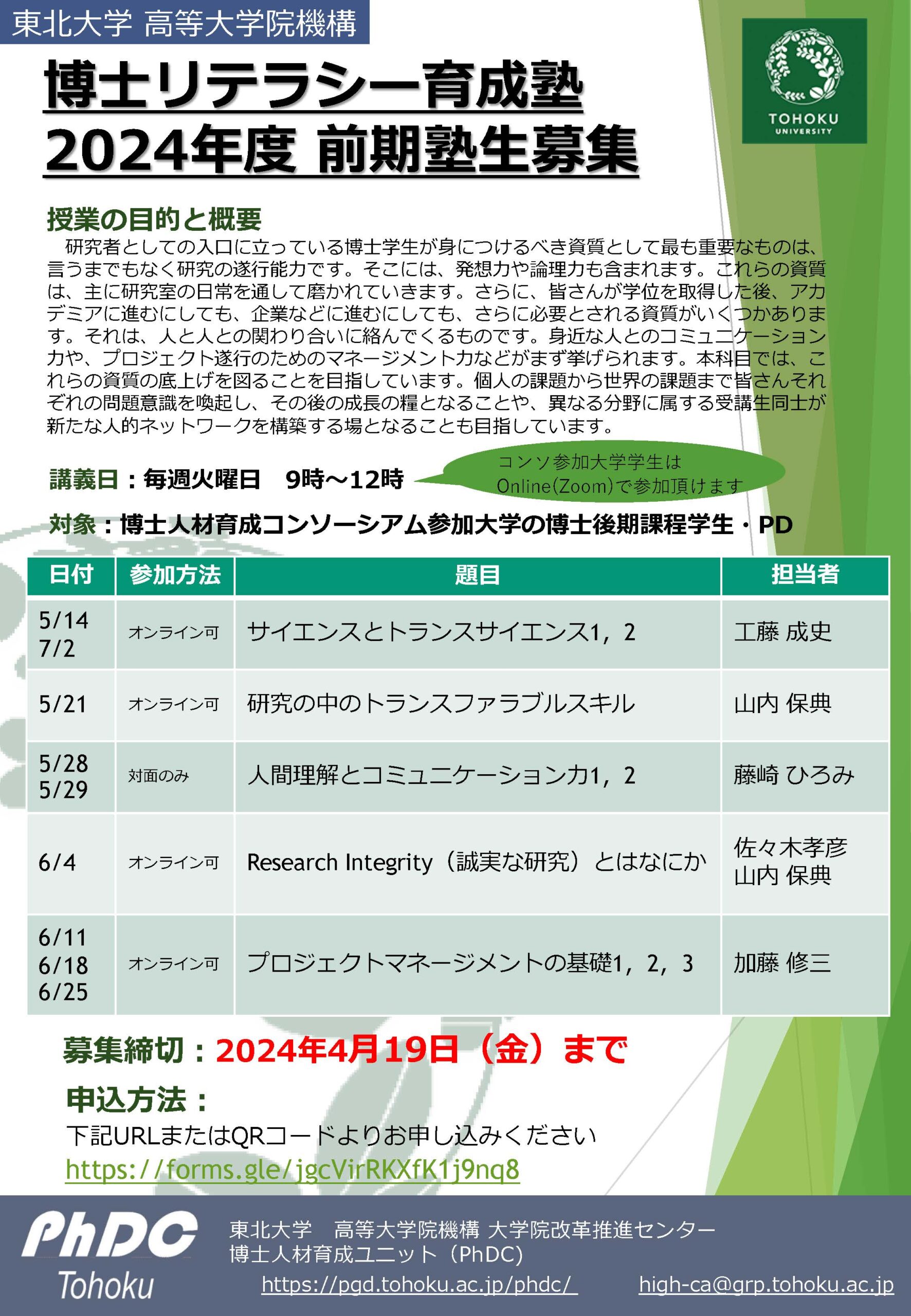 | 参加枠 | 各大学原則2名まで(申込状況によっては参加できない場合があります。その際は4月末ごろに東北大学から連絡がある予定です。) |