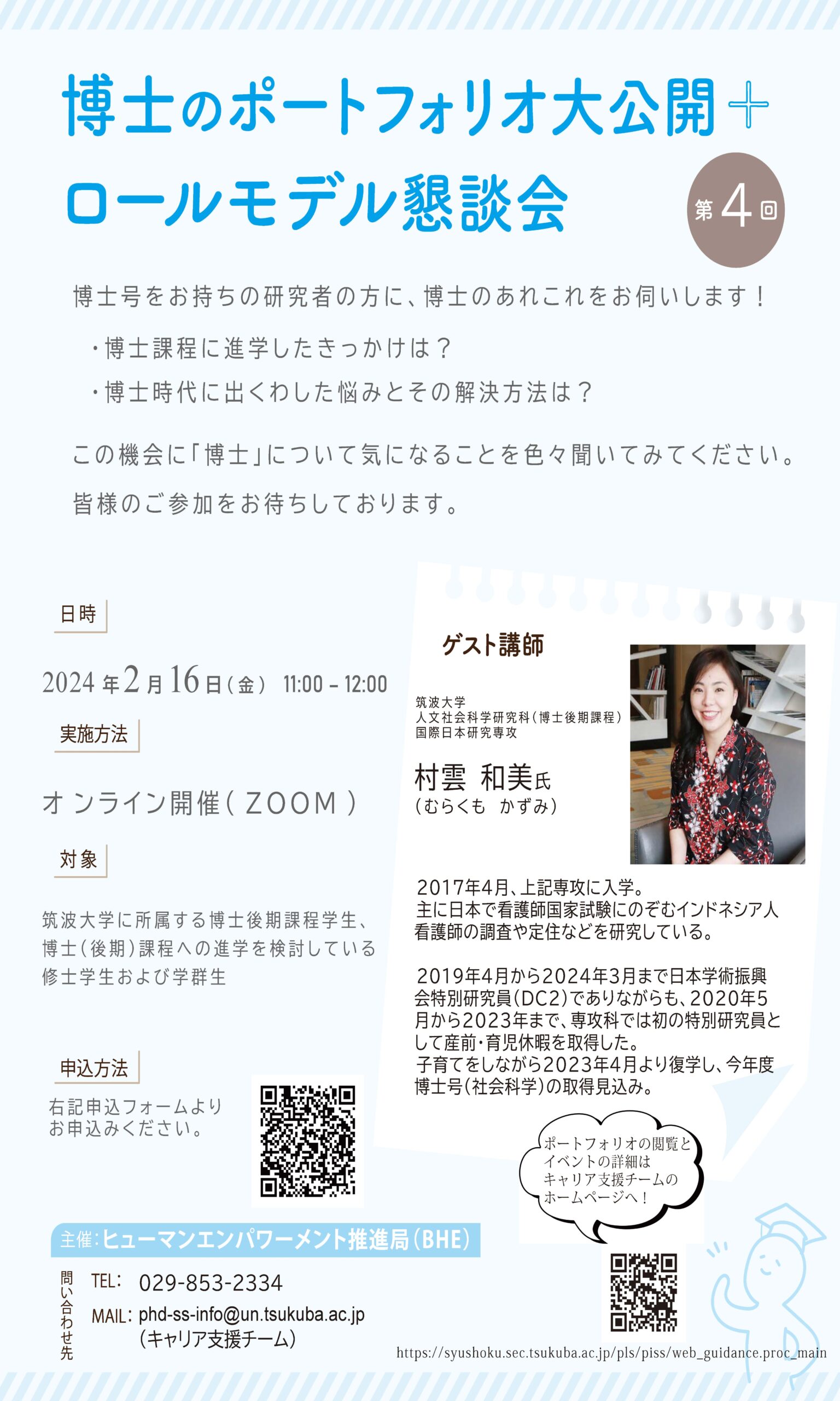 BHEの3チーム合同企画「博士のポートフォリオ+ロールモデル懇談会」の第4回についてお知らせします。