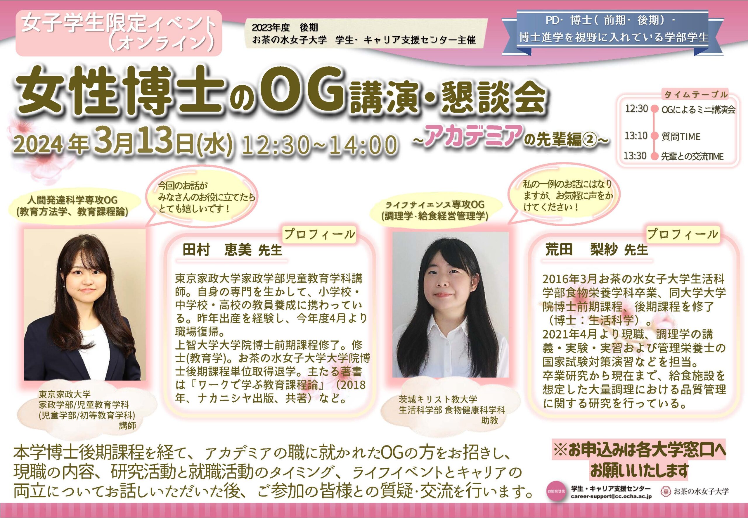 まだまだ少ない女性博士のロールモデルや、他学の博士後期課程の女子学生と交流できる機会としてご活用ください。