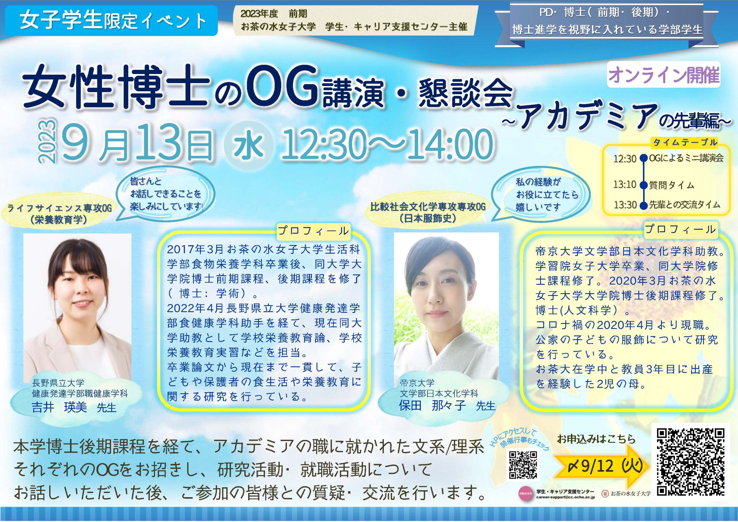 | タイムテーブル | 12:30~13:10 OG2名によるミニ講演 13:10~13:30 質問タイム 13:30~14:00 先輩方との交流タイム |