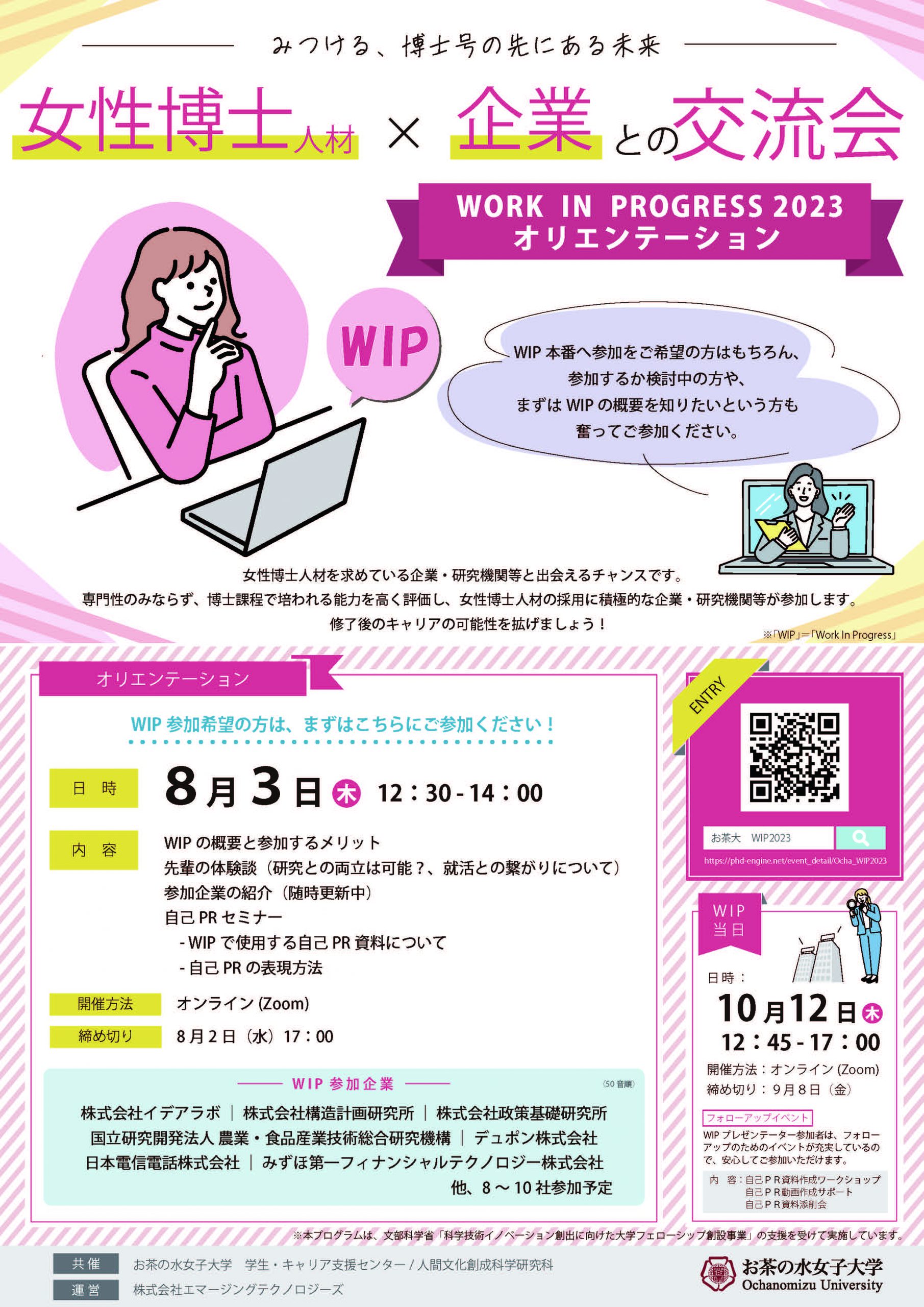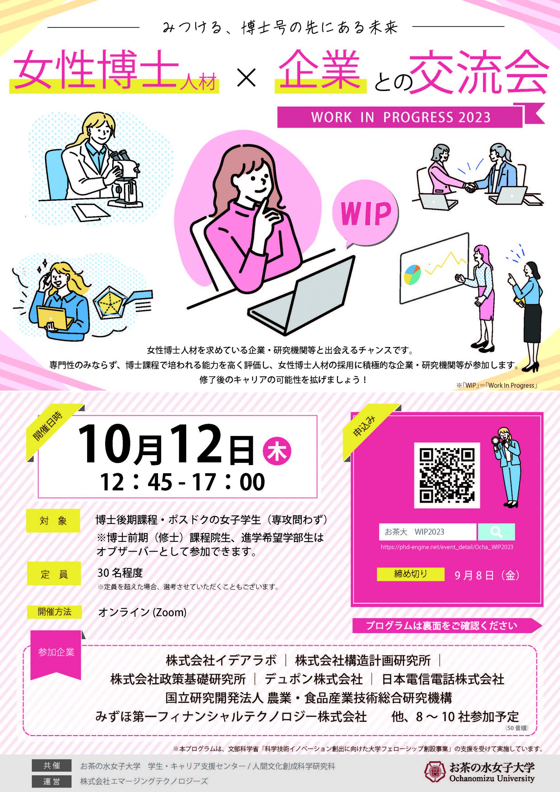 女性博士人材と企業との交流会「ワークインプログレス2023」(女子学生限定)
