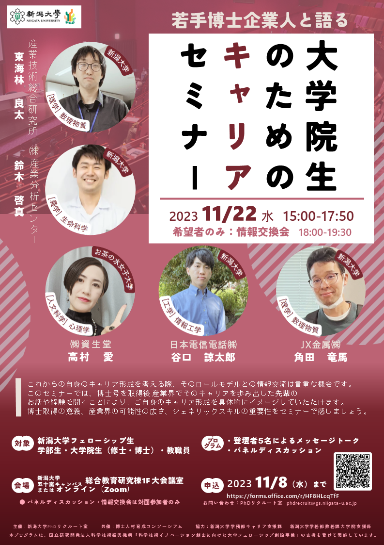 | パネリスト | ・ 東海林 良太 氏 (産業技術総合研究所/新潟大学 [理学]数理物質) ・ 鈴木 啓真 氏 ((株)産業分析センター/新潟大学 [農学]生命科学) ・ 高村 愛 氏 ((株)資生堂/お茶の水女子大学 [人文科学]心理学) ・ 谷口 諒太郎 氏 (日本電信電話(株)/新潟大学 [工学]情報工学) ・ 角田 竜馬 氏 (JX金属(株)/新潟大学 [理学]数理物質) |