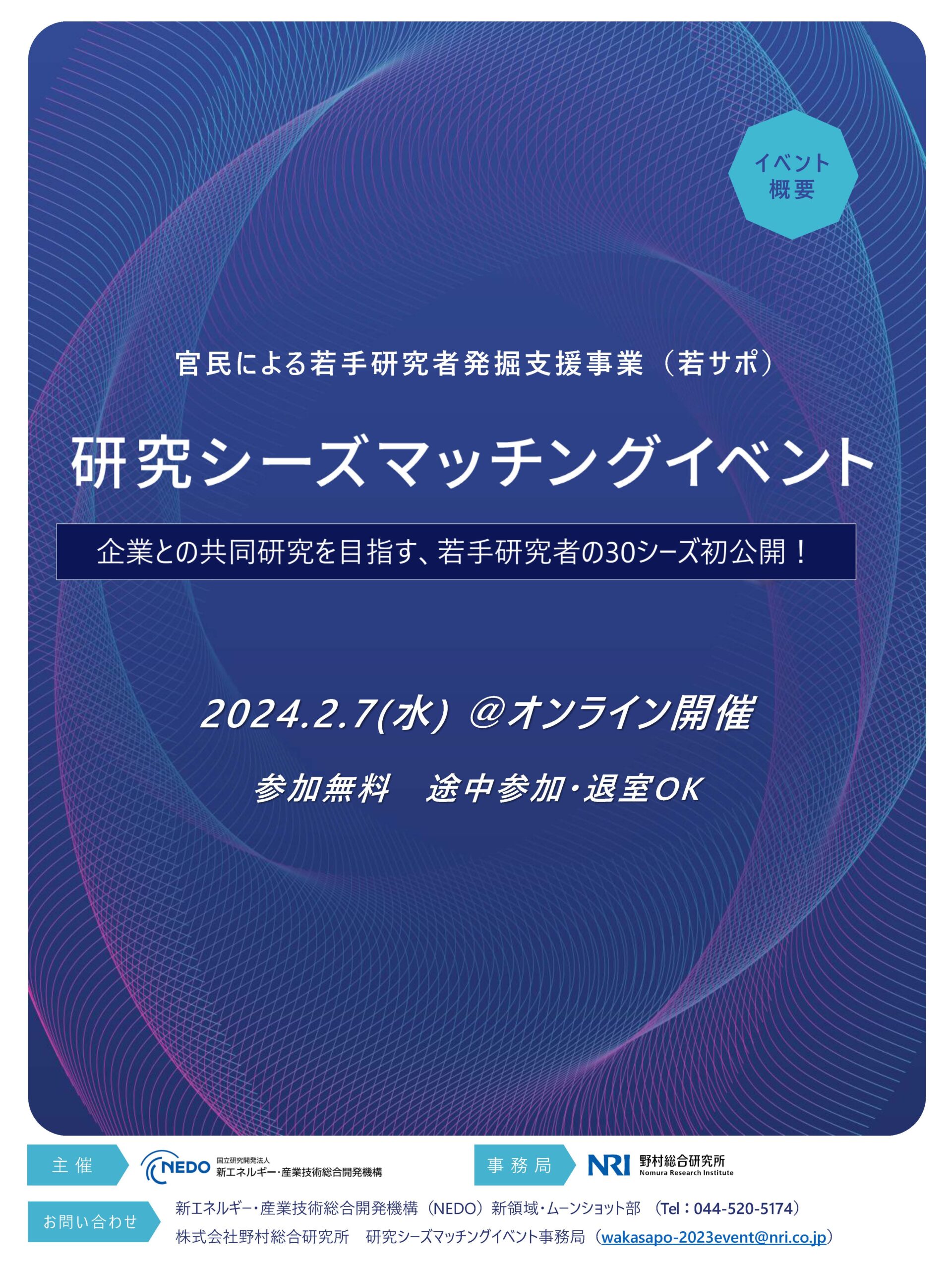 NEDOが推進する「官民による若手研究者発掘支援事業」(若サポ)において採択された、若手研究者の研究開発テーマを多くの方に知っていただき、企業の技術ニーズとつなげることを目的として、オンラインマッチングイベントを開催します。