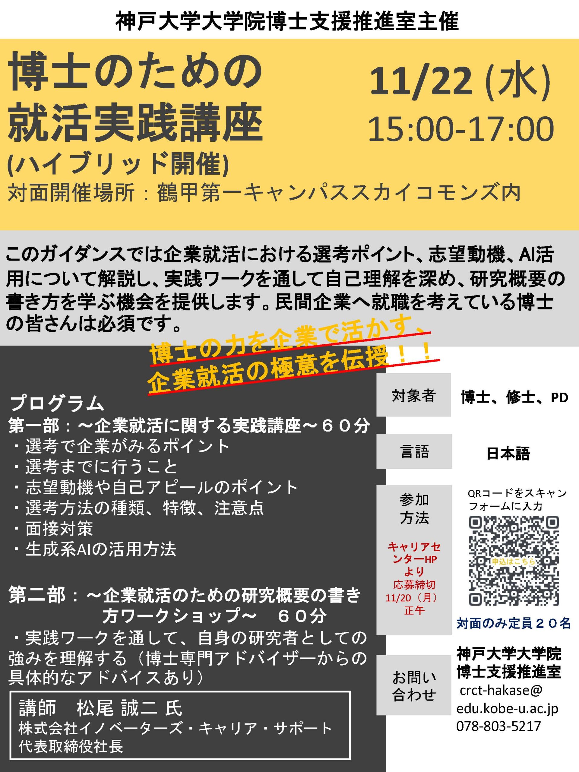 このガイダンスでは企業就活における選考ポイント、志望動機、AI 活用について解説し、実践ワークを通して自己理解を深め、研究概要の書き方を学ぶ機会を提供します。