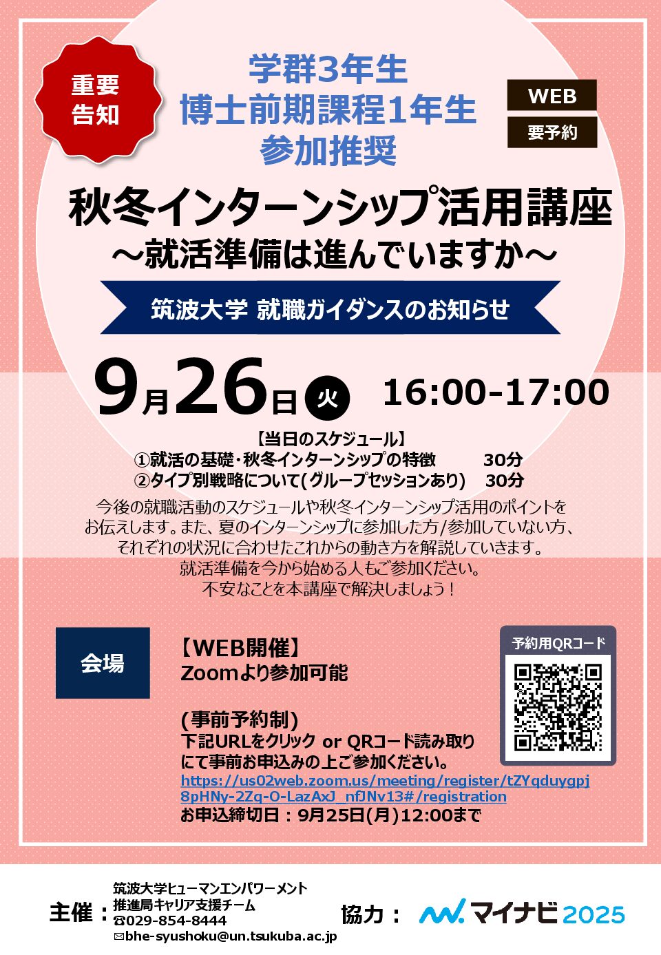 2023.09.26(火) 学群3年 修士1年(M1) 秋冬インターンシップ活用講座 ~就活準備は進んでいますか~ インターンシップ 、就職活動 秋冬インターンシップ活用講座のご案内です。 いま知っておくべきこと、やるべきことの基本を解説します。 就活生は必見です。ぜひご参加ください! ○開催日時:9月26日(火) 16:00~17:00 ○方 法 :ZOOMより参加可能 お申込みフォーム(事前予約制) お申込みはこちら 9/25(月)12:00まで 申込フォーム PREV 一覧へ戻る NEXT