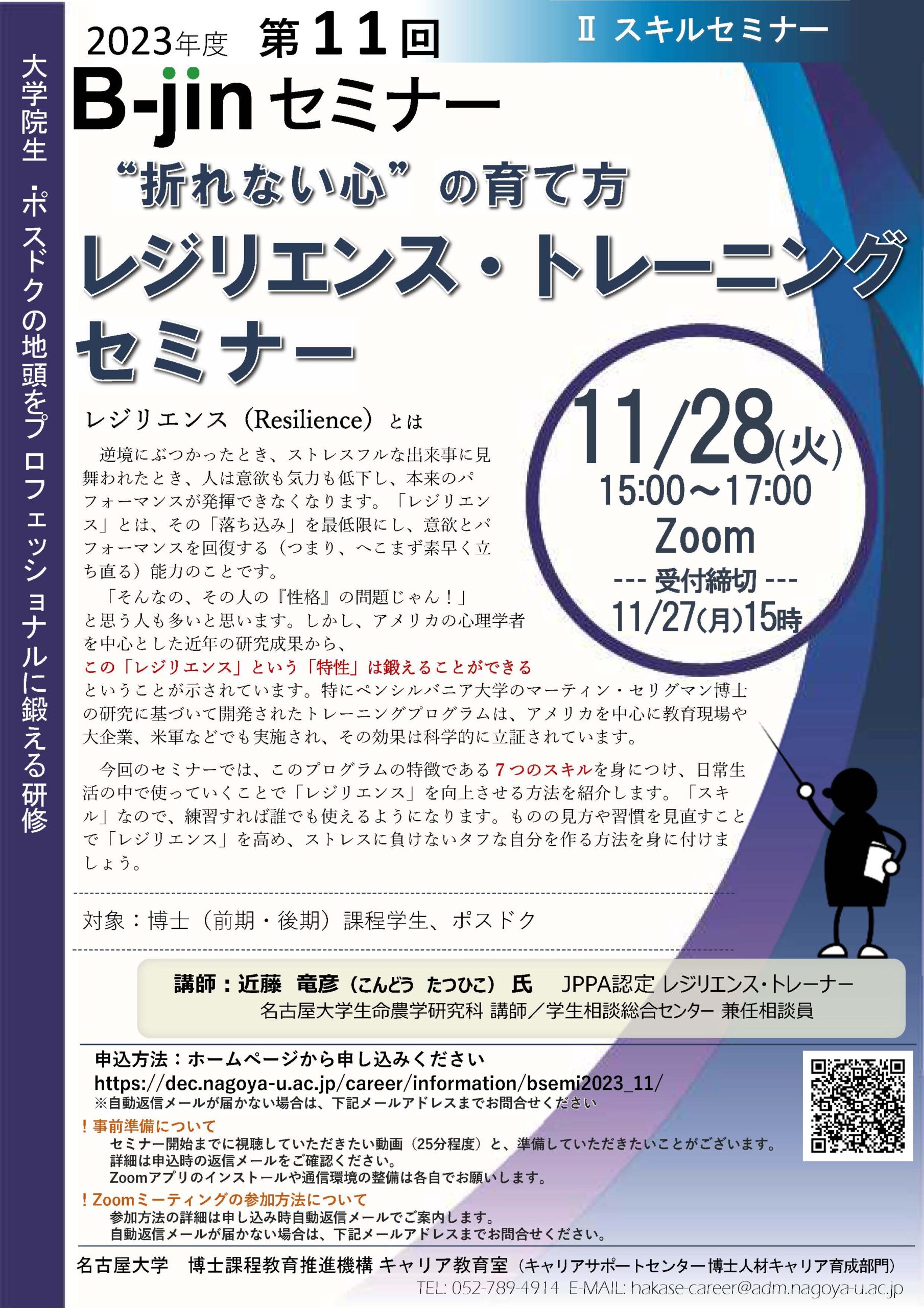| 講 師 | 近藤 竜彦 氏 (JPPA認定レジリエンス・トレーナー) 名古屋大学生命農学研究科 講師/ 学生支援センター兼任相談員 |