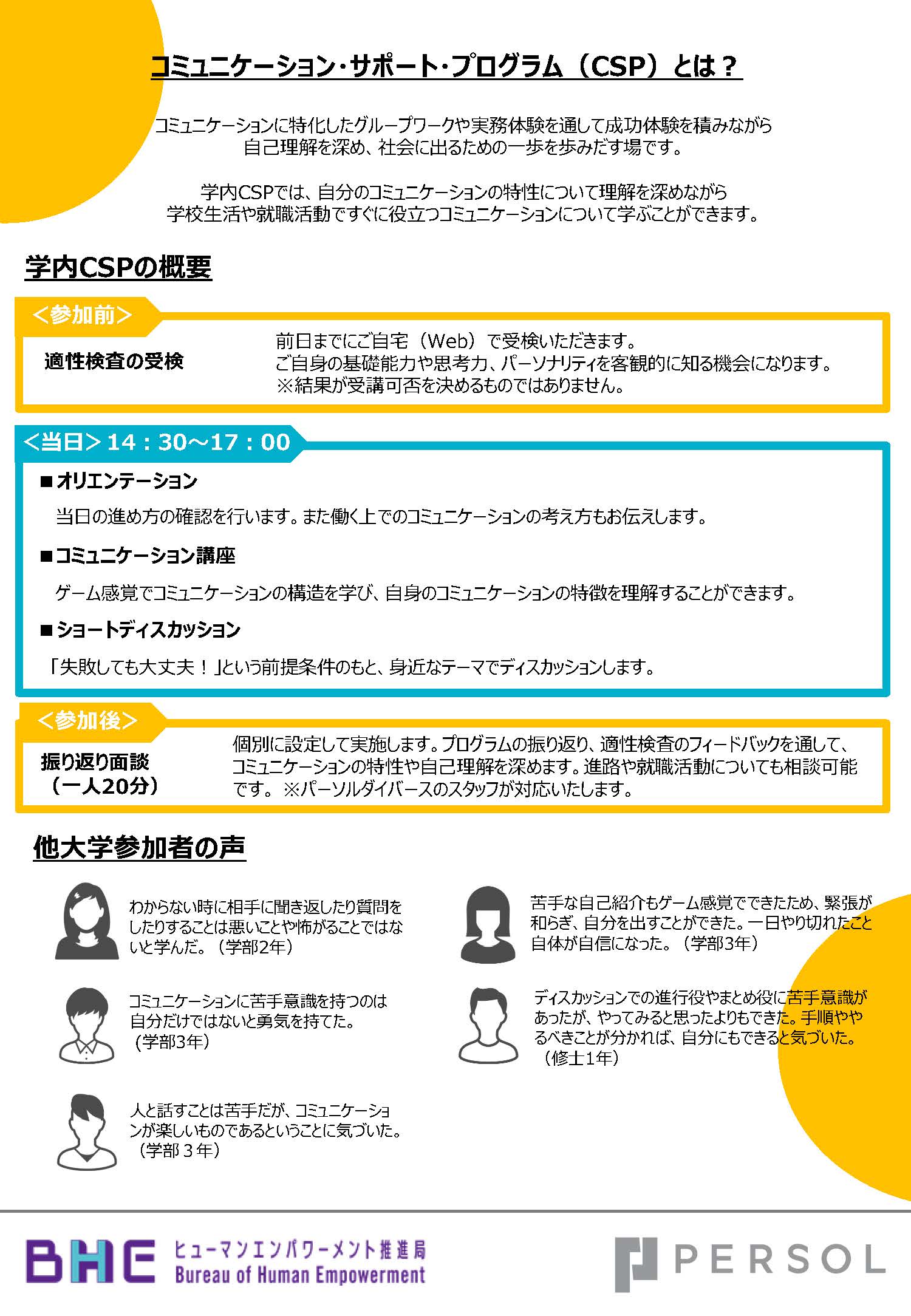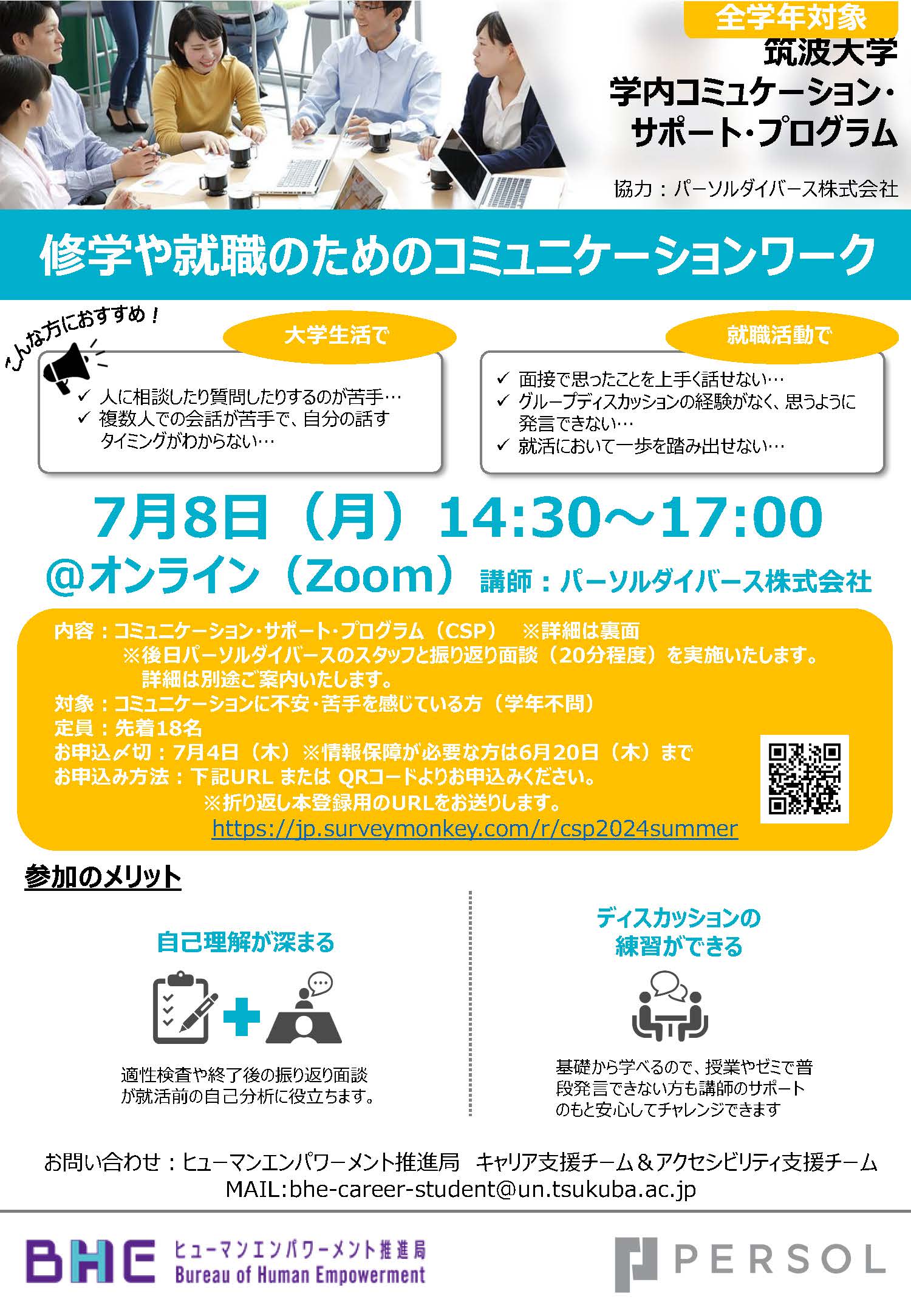 自分のコミュニケーションの特性について理解を深めながら学校生活や就職活動で役立つコミュニケーションについて学ぶ講座です。このイベントはBHE主催のもと、パーソルダイバース株式会社のコミュニケーション・サポート・プログラム(CSP)を筑波大学生向けにアレンジして実施致します。