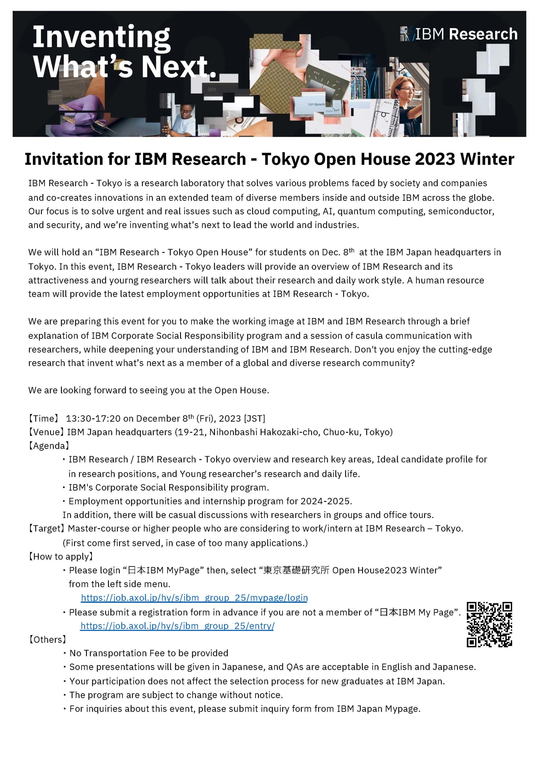 2023年12月8日(金) に学生を対象とした「IBM 東京基礎研究所Open House」を日本アイ・ビー・エム株式会社本社にて現地開催いたします。東京基礎研究所のリーダーや若手研究員からIBM Researchの概要、魅力、日々の働き方などお伝えすると共に、人事からは最新の採用情報をお伝えします。