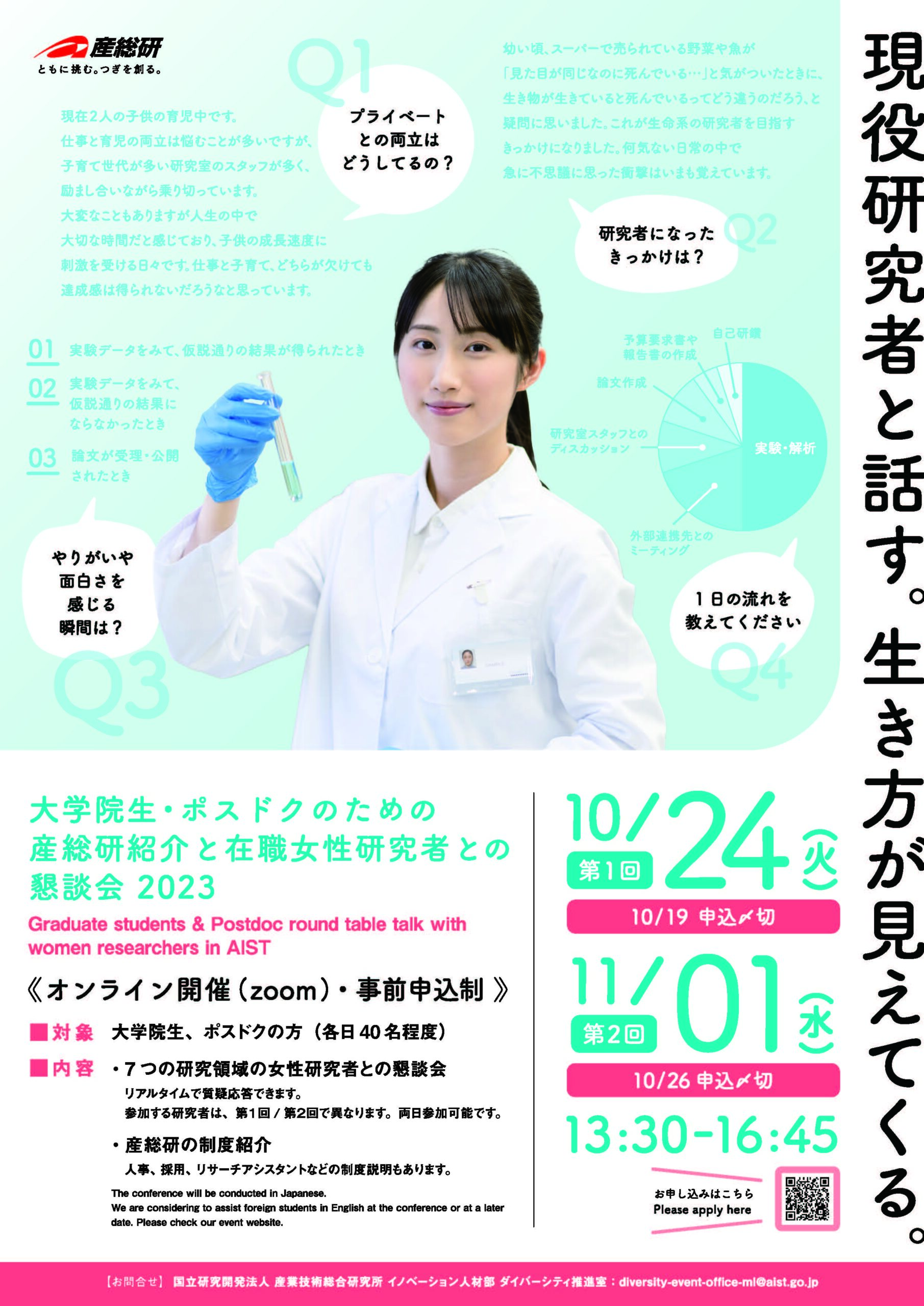 産総研ダイバーシティ推進室では、大学院生・ポスドク等の方々にむけて、女性研究者とのオンライン懇談会を開催いたします。