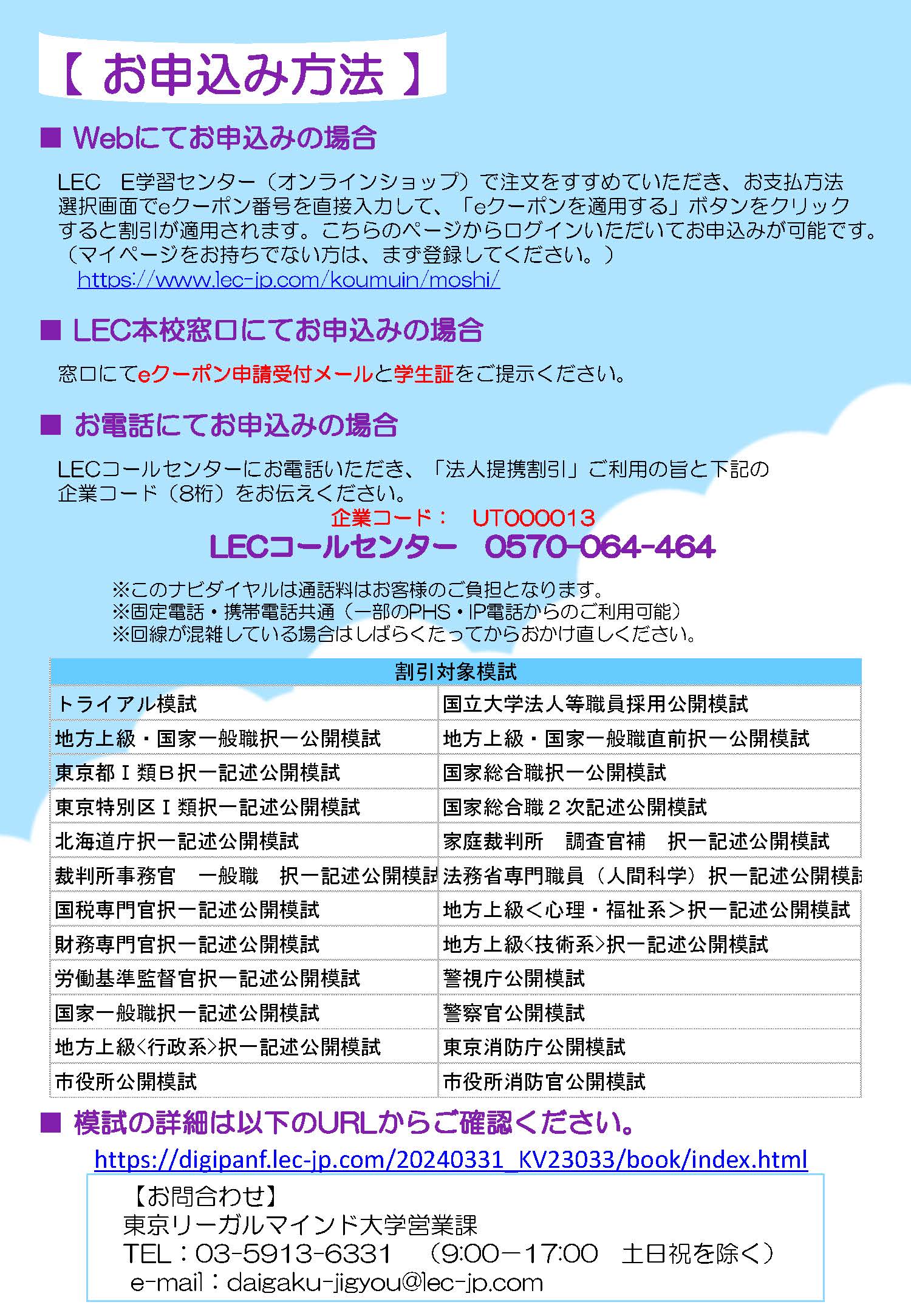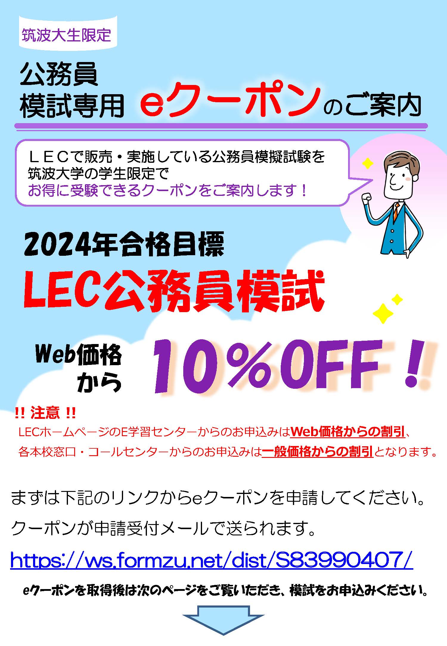 2024年合格目標対象 LECで販売・実施している公務員模試を筑波大生限定でお得に受験できるクーポンのご案内です。 詳細は添付を確認の上、WEB・LEC本校窓口・電話にて申し込んでください。 ※割引対象模試を必ず確認してください。