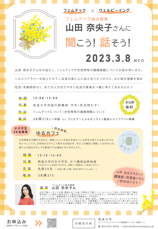 ※ヒューマンエンパワーメント推進局(BHE)ジェンダー支援チームよりお知らせです。![]() 2023年3月8日(水)に フェムテック×ウェルビーイング 「フェムテック協会理事 山田奈央子さんに聞こう!話そう!」 を開催します! 本イベントは ・フェムテック協会の理事を務められる山田奈央子さんによるフェムテック講演会 ・筑波大学の女子学生限定の交流会 の2本柱でお届けいたします。 ぜひチラシにて、詳細情報もあわせてご覧ください。 --------------- ① ~ 筑波大学所属の教職員・学生対象 ~ 『フェムテック講演会』 【日時】2023年3月8日(水)12:00-13:00(開場11:55) 【会場】3B棟210 での対面、及びオンライン配信(ウェビナー)のハイブリット開催 【内容】フェムテックについて / 女性特有の健康課題について 【対象】筑波大学所属の教職員・学生(性別問わず) ② ~ 筑波大学の女子学生対象 ~ 『ゆるカフェ』 🌟講師の山田 奈央子先生には「ゆるカフェ」にもご参加いただきます。 女性特有の不調や不安など、相談しにくいお悩みがあれば、ぜひこの機会にご相談してみませんか? 【日時】2023年3月8日(水)13:10-14:00 【会場】3B棟213 ※交流会に参加される方には、①講演会の視聴会場をご用意しています 【対象】筑波大学所属の女子学生、かつ①講演会の参加者(限定20名) ------------------------- 【申込方法】以下URLからお申込みください。 http://forms.office.com/r/CwCvtXLYmy(参加費無料) ※②交流会への参加を希望される方は、該当項目にチェックを入れてください。 【申込締切日】2023/3/6 (月) 【お問合せ先】 BHE/ジェンダー支援チーム TEL:029-853-8504 FAX:029-853-8505 Mail:diversity♯@♯un.tsukuba.ac.jp (♯を取り除いてください) |